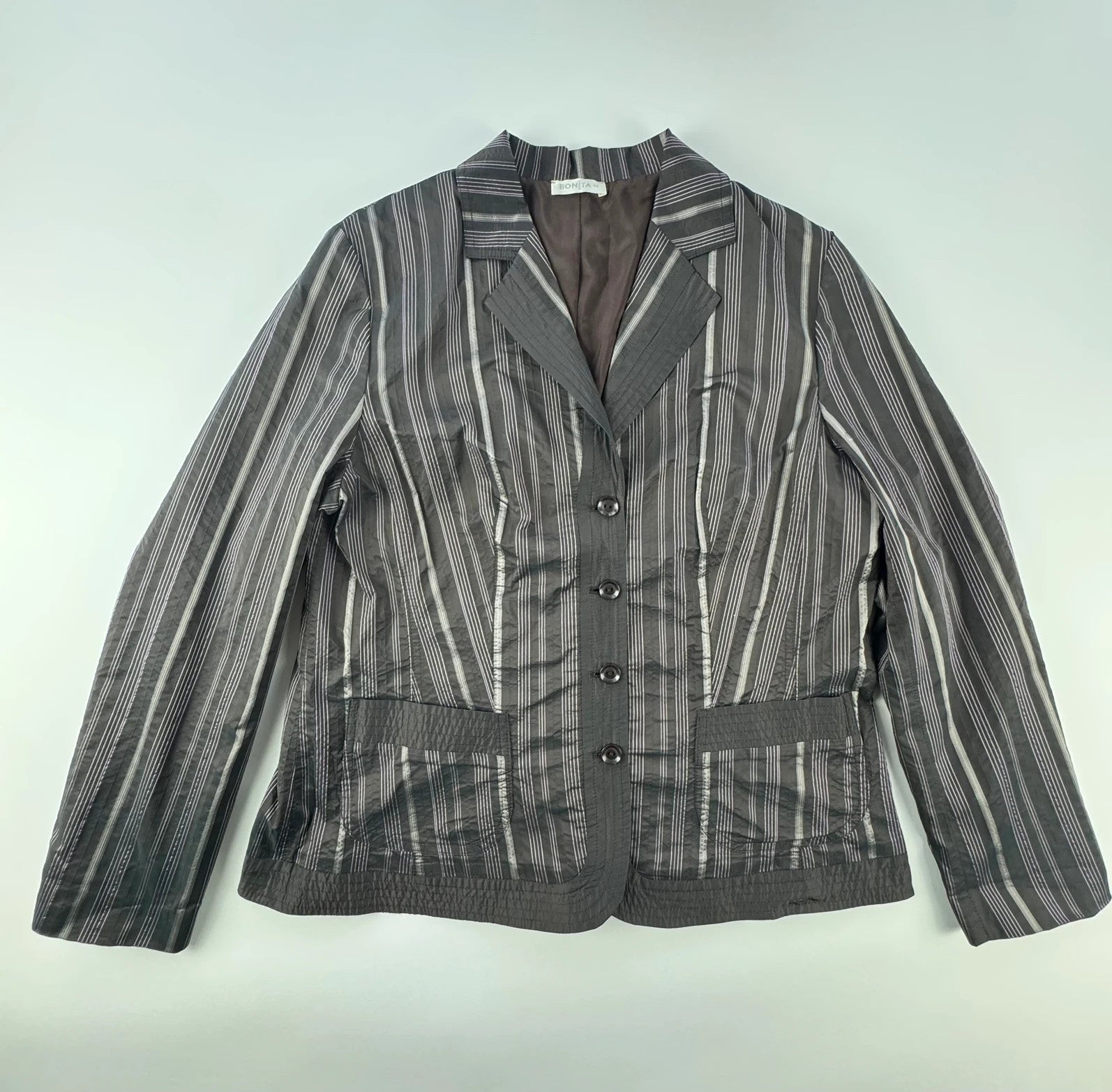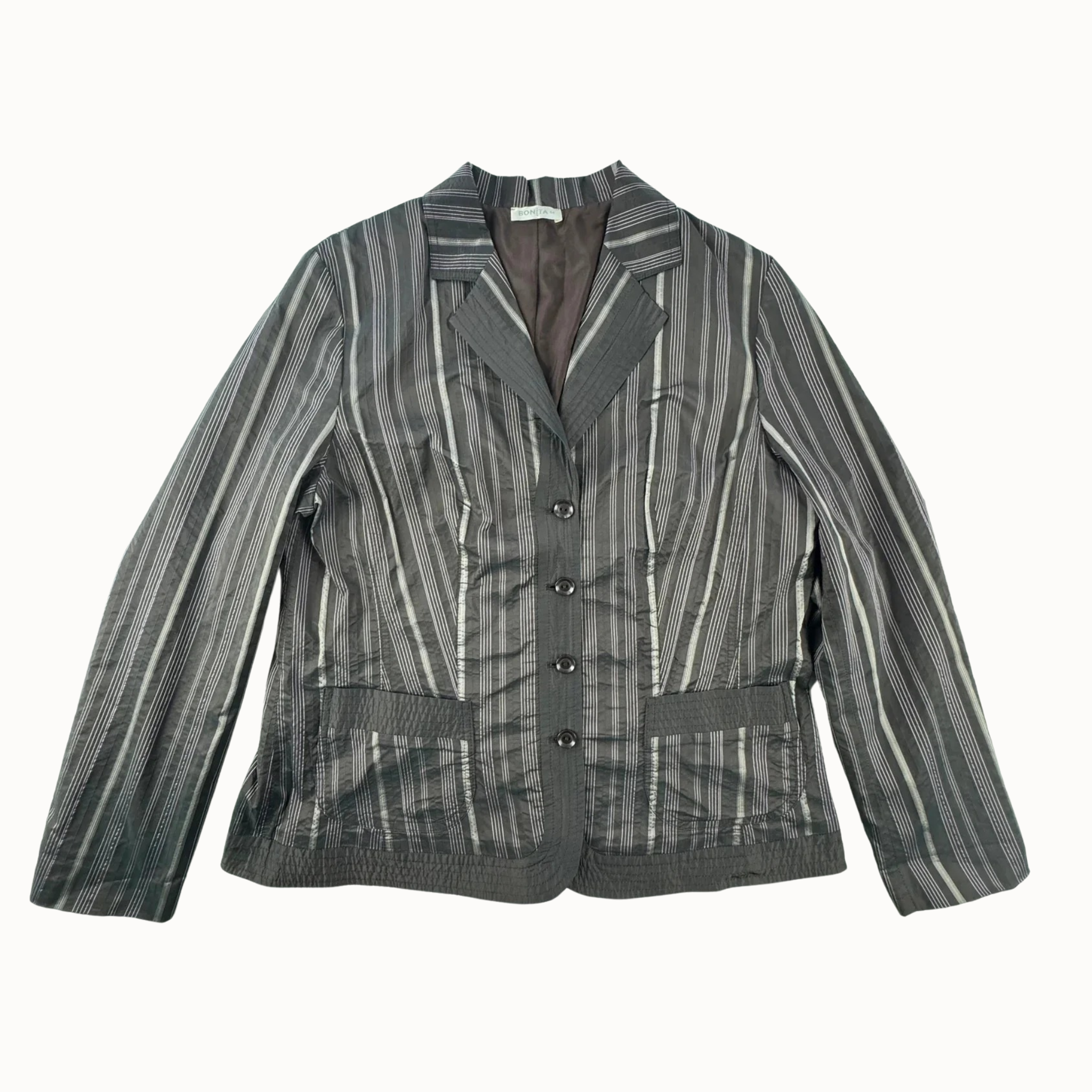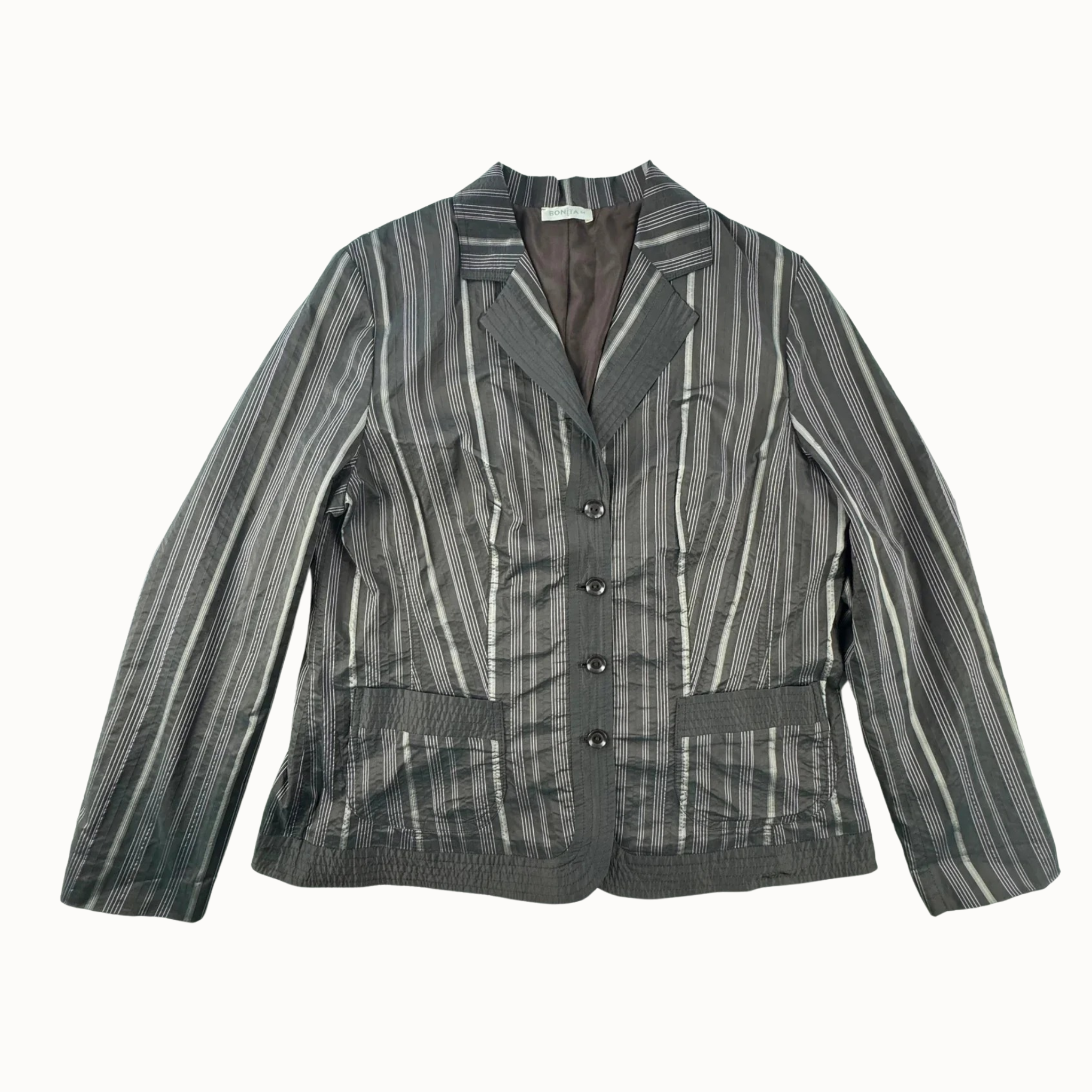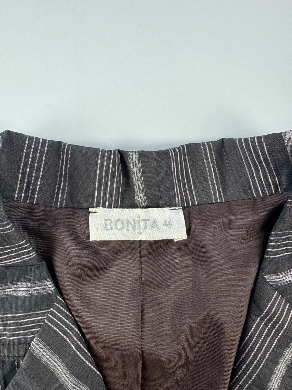 Šis Bonita moteriškas dryžuotas švarkelis XXL yra puikus pasirinkimas elegantiškam ir unikaliam vintage stiliaus įvaizdžiui. Su savo puikios būklės, be defektų dizainu, jis išsiskiria savo kokybe ir stiliumi, todėl tapo nepamainoma garderobo dalimi.