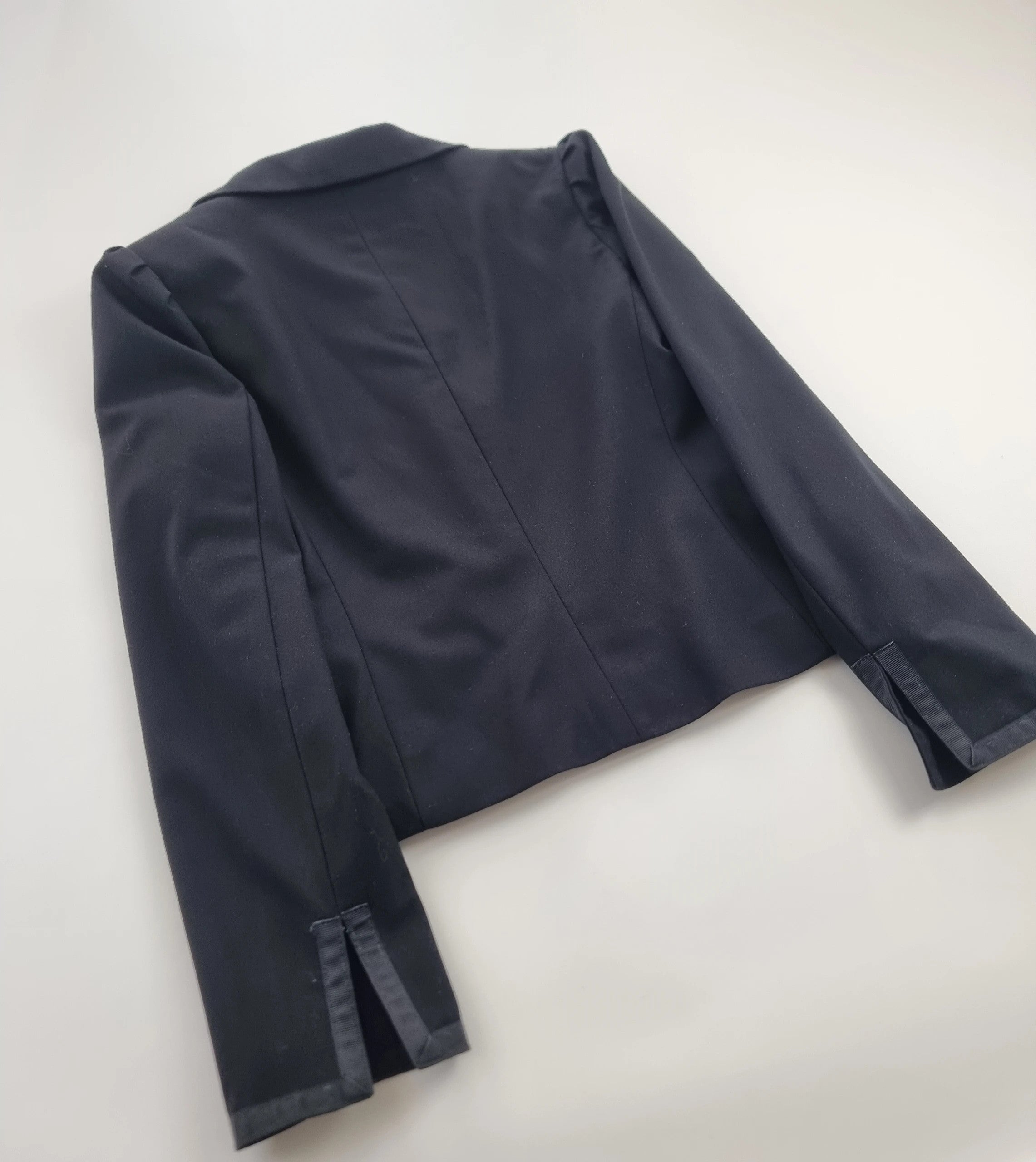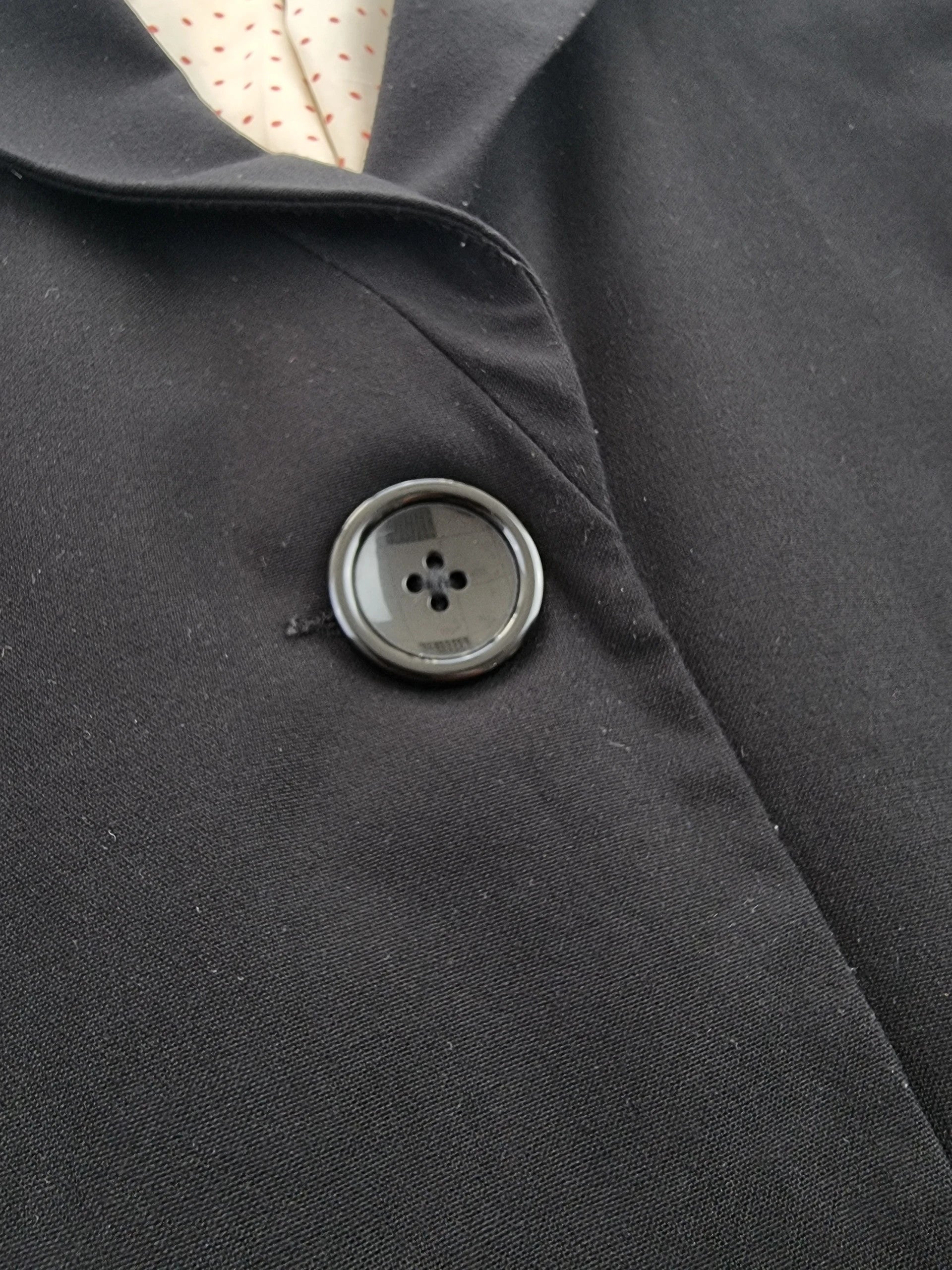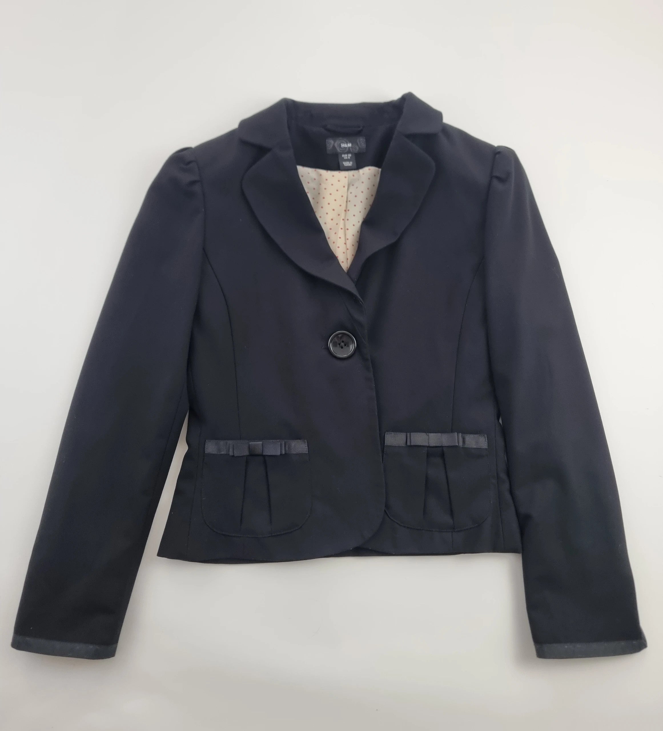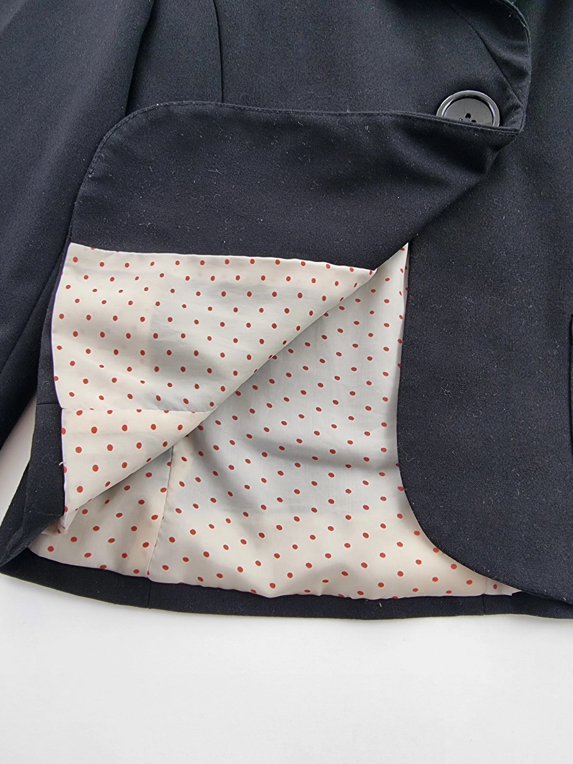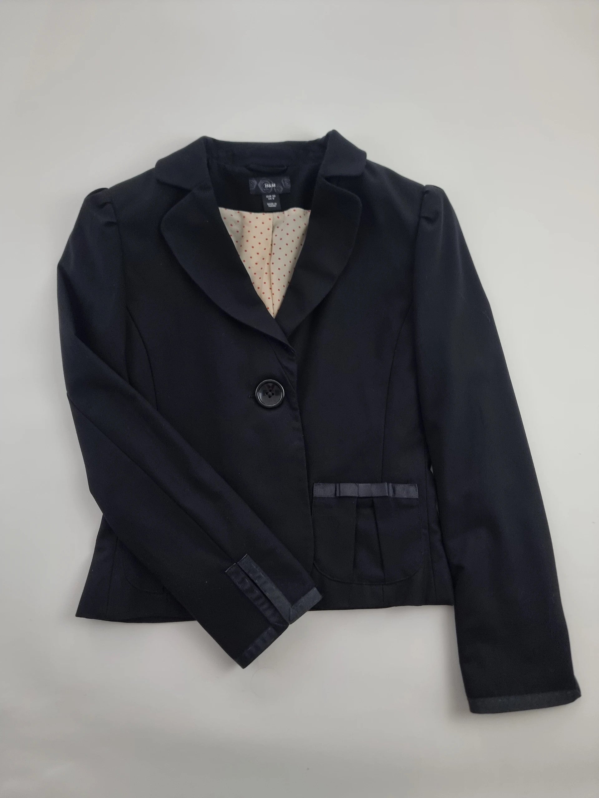 Šis juodas moteriškas švarkelis su polka dots pamušalu yra puikus pasirinkimas elegantiškoms progoms. S/36 dydžio, jis puikiai tinka bet kokiai aprangai ir suteikia stilingumo bet kuriuo metų laiku.